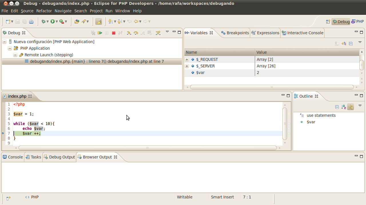 Avanzar el breakpoint pulsando F6. Podréis ir viendo el valor de la variable $var en la pestaña Variables.